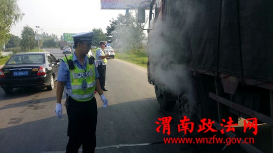 7月7日上午,临渭交警大队固市中队民警对一辆因轮胎自燃引起烟气,却还在行驶的车辆紧急拦停进行处理,及时消除安全隐患