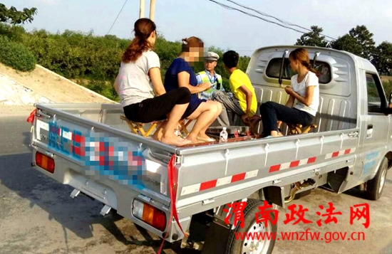 临渭交警大队交斜中队民警对一辆小型货车违法载人进行查处