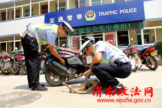 临渭交警大队一中队民警对查处的无牌、无证、非法改装摩托车进行排气管拆解