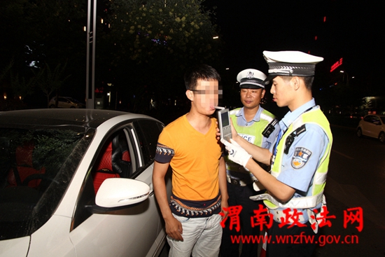 临渭交警大队二中队民警对驾驶人进行酒精检测
