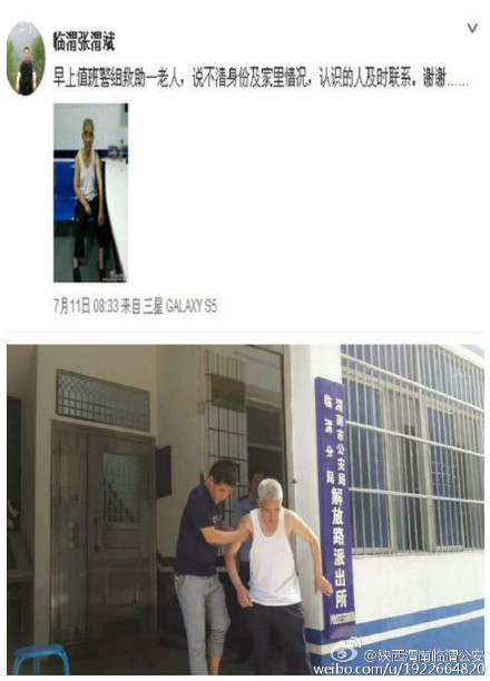 【救助老人】7月11日7时50分,临渭公安解放所民警在出警回所路上,发现一老人在路边来回徘徊,民警立即停车询问情况,但是这位老人口齿不清,难以沟通。民警便将老人带回派出所,通过微博、微信发布消息,及时帮助老人找到家人,赢得了老人家属的称赞。