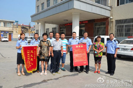 【锦旗送给救火英雄】昨日上午,华阴市城区望岳楼居民小区住户宋某带领全家来到华阴市公安局鸣放鞭炮,送来写有“灭火救人,人民生命财产保护神”的锦旗一面、感谢信一封,对7月12日火灾事故中救他们全家于危难之中的全体民警表示衷心感谢