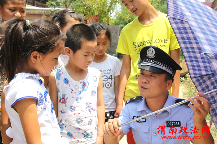 民警在辖区神芝村为留守孩子讲解雷雨天打伞时的正确方法和避雷电知识。