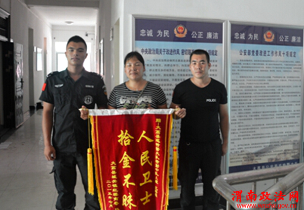 渭南政法网(特约通讯员 刘海滨 惠锐敏)7月25日,大荔县公安局巡特警大队特勤中队队员孟红立和王朕雄巡逻时捡到一个钱包,里面装有5000 现金和一张银行卡。想到失主丢了钱一定很着急,就马上到银行营业厅请银行工作人员帮忙查询,通过银行卡信息很快联系上失主将钱包当面归还。7月28日,失 主来到巡特警大队,特意为这两名拾金不昧的特警队员送上一面锦旗,表示谢意。