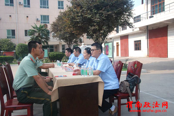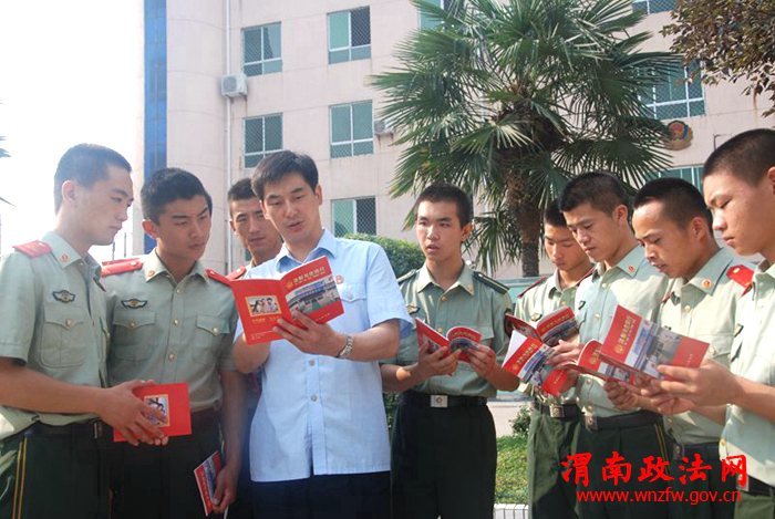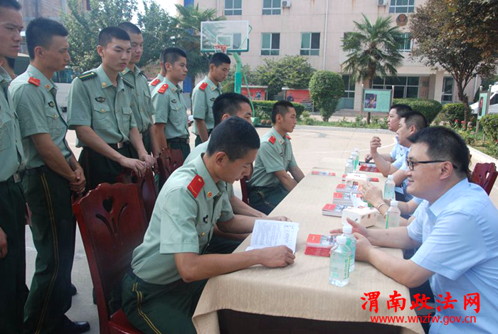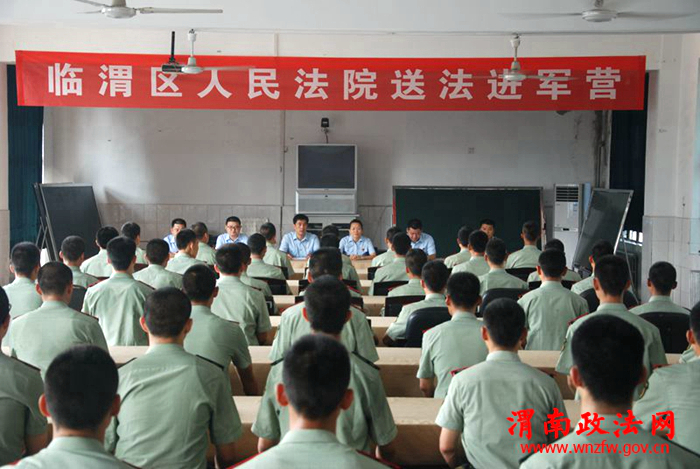 渭南政法网(特约通讯员 周东峰 高增恩)为了提高部队官兵的法律意识,保障军人的合法权益,7月30日,在八一建军节来临之际,临渭法院法官干警走进武警渭南支队,开展“送法进军营”法制报告会和普法宣传活动,向官兵发放有关法制宣传资料,积极为广大官兵提供法律咨询和法律帮助。