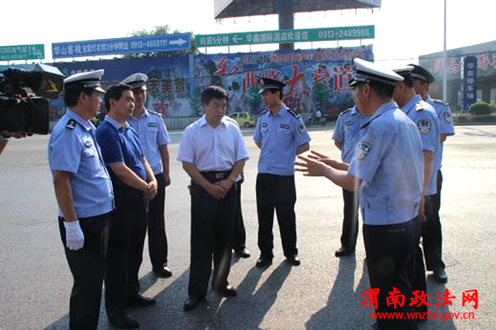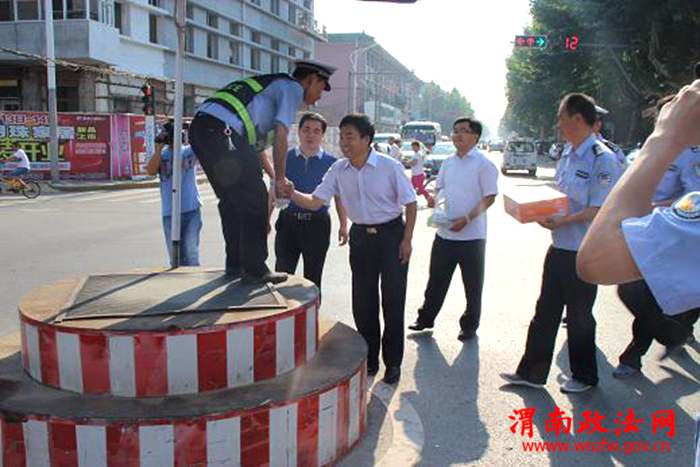 渭南政法网(华阴交警大队讯)入暑以来,天气炎热,持续高温,给交通管理工作带来了严峻挑战。为全力做好高温天气下道路安全管理工作,华阴交警大队采取轮流上岗坚持高温不下火线指挥疏导交通,路面执勤民警的安慰始终牵挂着市上主要领导的心。7月29日上午,市委书记卢发兴、常务副市长刘宝琳在市公安局局长淘水龙、政委杨聪杰、副局长交警大队大队长程伟峰的陪同下,来到城区中队各执勤点,亲切看望慰问高温下执勤交警,为他们送来了饮料、白糖等防暑降温慰问品。