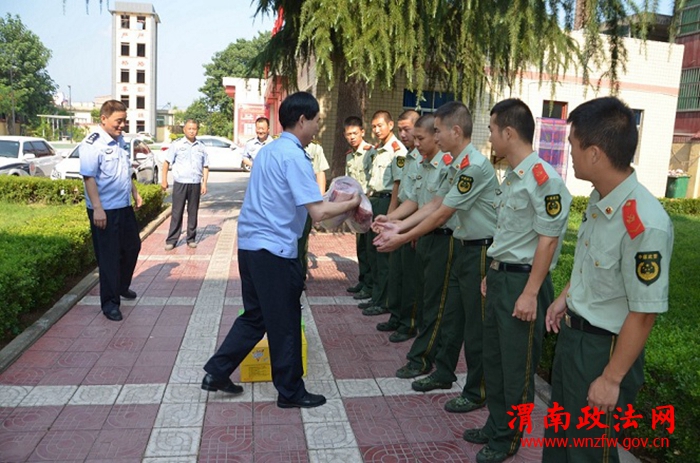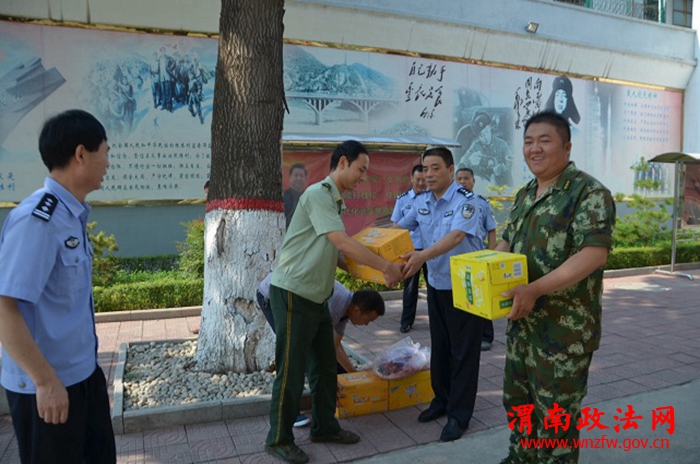 渭南政法网(特约通讯员 谢磊)今年是中国人民解放军建军88周年,也是中国人民抗日战争胜利暨世界反法西斯战争胜利70周年,为了关心部队建设,强化军地友谊,迎接“八一”建军节的到来,7月30日,华阴市政府党组成员、公安局党委书记、局长陶水龙,带领公安局全体党委班子全体成员在局指挥中心主任姜涛、政治处教导员张该文、警务保障室教导员蔡伟等人员陪同下来到中国人民解放军驻华阴部队、消防大队、武警中队,开展慰问活动,向官兵们送去节日的祝福和问候并送上慰问品,感谢他们为华阴经济社会发展做出的重要贡献。