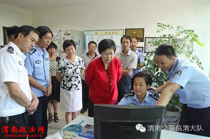潘部长一行首先逐层参观了具有临渭交警特色和精神内涵的文化长廊,认真听取了文化长廊每张照片背后的故事,实地察看了大队创新宣传形式开展的双微平台运行流程,对大队双微平台的建设给予了高度的肯定和赞扬,并当场加入了大队微信公众号。