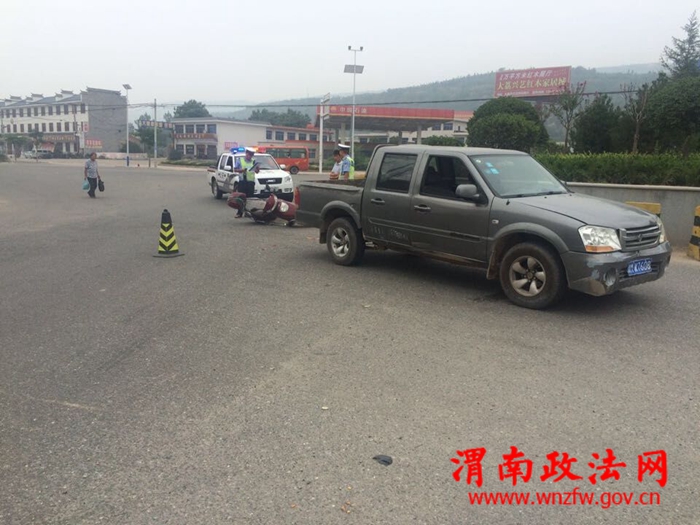 渭南政法网(特约通讯员 汤朗武 王栋炜)8月11日上午9时20分,潼关县交警秦东中队中队长孙英勃带领中队1336班组民警陶岗卫、郭朋涛等民警在秦东省际交通安全检查站正常执勤。一辆由东向西行驶的轻型普通货车与一辆由南往北行驶的两轮电动车,在秦东环岛东侧北端的交叉路口相撞。