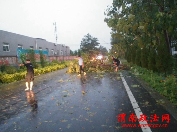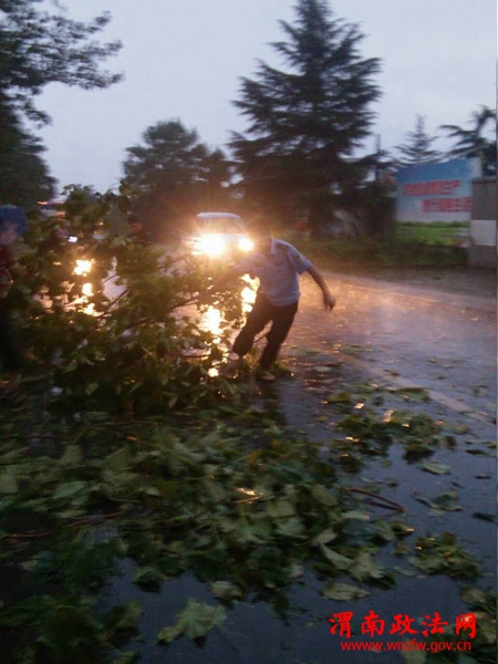 值班民警张鉴带领三名协勤主动上路巡查,发现310国道代字营路段有两棵直径约10公分大树被拦腰折断,横卧在国道中间,致使来往车辆通行受阻。看到此情况后,民警先尝试将大树搬开,由于树枝较大,且已经被雨水浸透,民警尝试了几次都无法搬动。民警急中生智:从附近群众家里借来斧头,冒雨将大树的树枝劈下后连搬带拉,连搬带推的挪动树枝。这时过路的群众,也停下车来帮忙;经过警民十几分钟的努力,终于将大树枝挪到了路边,来往的车辆终于安全顺利通行。