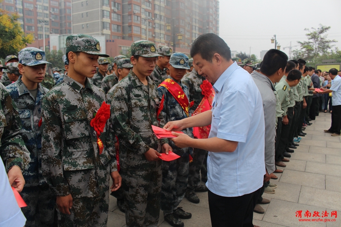 渭南政法网(特约通讯员 王建军)9月9日10时许,合阳县天和园北广场锣鼓喧天、鞭炮齐鸣。合阳县委、县政府在这里隆重集会,热烈欢送208名应征青年光荣入伍。在欢送仪式中,合阳县法院副院长宁卫中与维军合议庭全体成员一道将该院精心制作的《军人军属合法权益保护卡》亲自送到每位入伍新兵的手中,为每一位新兵及家长送上了一份“军地连心卡”,受到了与会干部群众的一致好评。