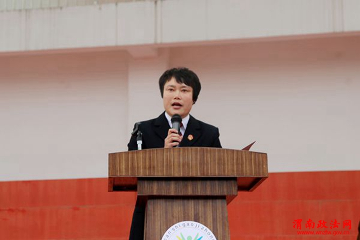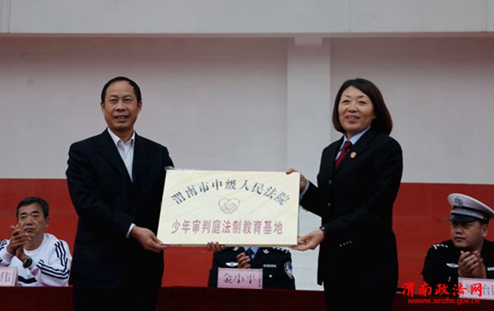为了使法制进校园活动常态化,渭南中院少年审判庭庭长连玲代表渭南中院将“渭南中院少年审判庭法制教育基地”牌匾交到了渭南高级中学张校长手中,整个活动现场多次博得了师生们阵阵掌声。