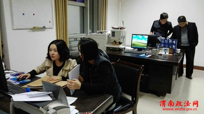 11月2日晚上,蒲城法院诉讼服务中心的灯还亮着,工作人员正在整理录入当天新收的案件。