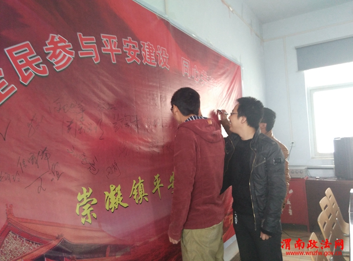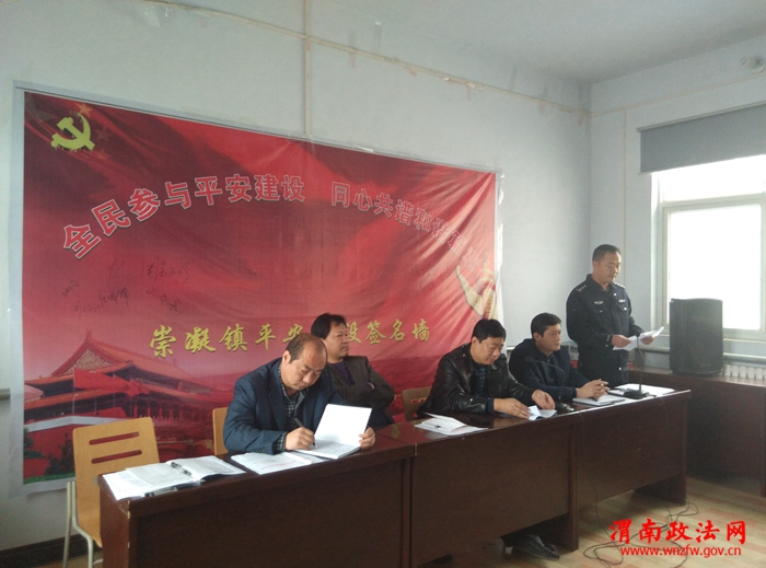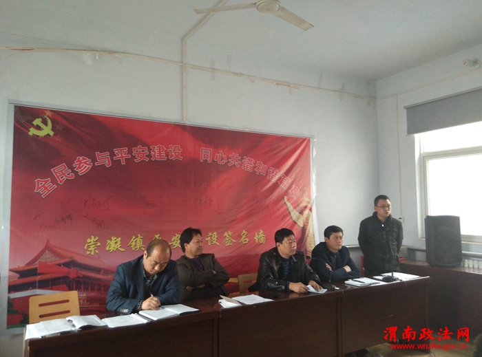 当会全体参会人员参与了“全民参与平安建设,同心共谱和谐篇章”主题签名活动,会议由镇党委书 记耿勃主持,镇党委副书记、综治办主任康国光总结回顾了上半年工作,对近期平安建设进行了再动员再部署,镇党委副书记刘晓亮宣读了《关于成立崇凝镇平安建 设工作领导小组及督查组的决定》文件,崇凝派出所所长张博、崇凝法庭法官刘涛、崇凝初中校长张伟新、崇凝村支部书记李向锋就如何搞好平安建设各项工作任务 进行了表态发言,区委常委、政法委书记党发顺到会并作重要讲话。