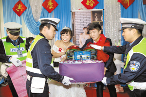 据悉,为新婚夫妇“送平安 送祝福”,在婚宴上提醒宾客“喝酒不开车,开车不喝酒”已成为市交警支队临渭大队当前开展交通安全宣传的一种新方式。如何让 广大群众了解交通安全法,临渭交警通过各种渠道,掌握婚礼信息,抓住农村婚礼人多热闹的机会,开展交安宣传,这种新颖的做法受到普遍欢迎。