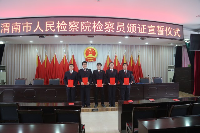 【渭南市检察院举行新任检察员颁证暨宣誓仪式】渭南市检察院新任检察员颁证暨宣誓仪式11月16日下午在市院举行。市人大人事代表工作委员会办公室 主任张国栋向五名检察员颁发了任命书。随后,五名检察员面向国旗和国徽庄严宣誓。检察官们面向国旗国徽庄严宣示,这不仅是对祖国的庄严承诺,也是对党和人 民的庄严承诺,对宪法和法律的庄严承诺。