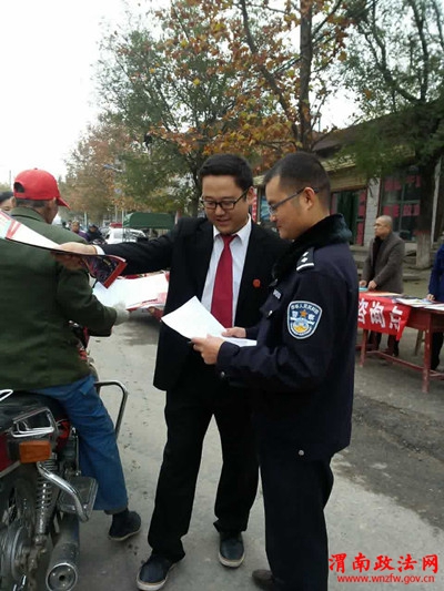 渭南政法网(特约通讯员 王乐)11月19日,正逢椿林镇上的集会,前来赶集的群众络绎不绝。冬日里阴沉的天气伴随着刺骨的寒风,但这并不能阻止工作人员开展平安蒲城宣传的热情。一大早,在县委政法委的组织下,蒲城县法院、公安局、检察院、司法局在椿林初级中学门口进行了一场别具特色的宣传,其中就有我院执二庭王军洲庭长带领执二庭干警进行宣传的身影。