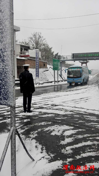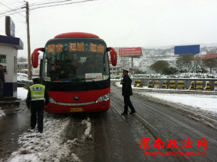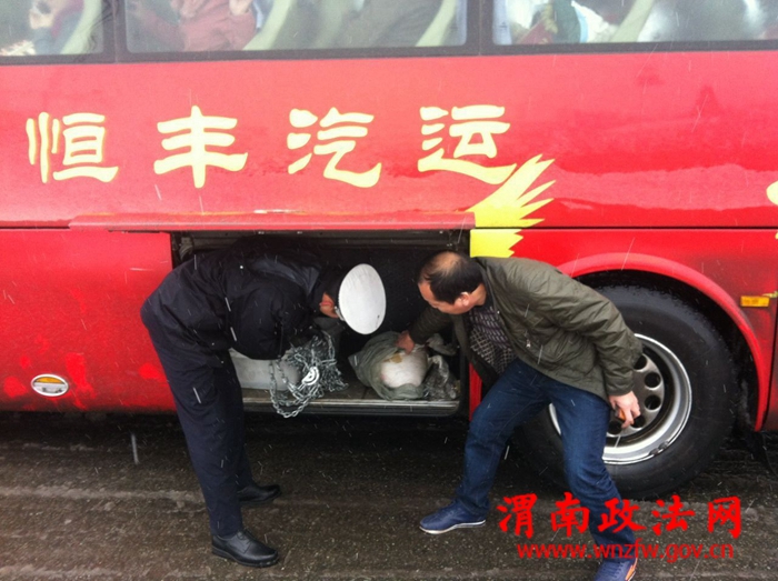 民警对途经检查站的客车进行安全检查,并告诫司机道路积雪湿滑请减速慢行。民警积极协助驾驶员安装防滑链,对潼关方向、豫灵方向的公交车检查防滑链安装情况,并检查车辆五小件,提醒司机道路湿滑注意安全行驶。