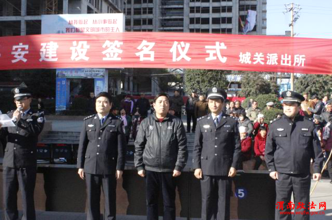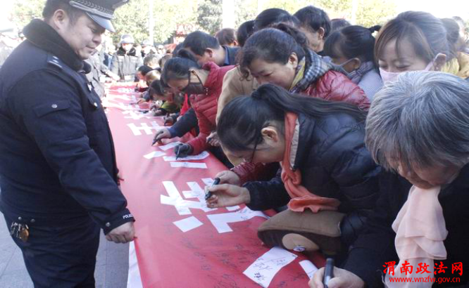 渭南政法网(特约通讯员 郝泽超)为进一步深入推进平安建设,营造全民参与平安建设的浓厚氛围,有效提升群众对平安建设的知晓率、公安队伍的满意率和社会治安的满意度,11月25日下午,城关派出所在县苹果广场隆重举行平安建设千人签名活动,县委政法委副书记段文龙、县公安局副局长刘渊、党委委员、城关派出所所长皇甫宏洲及城关派出所全体民警、企事业单位代表、社区干部、仓颉中学师生、各界群众近2000人参加了活动。