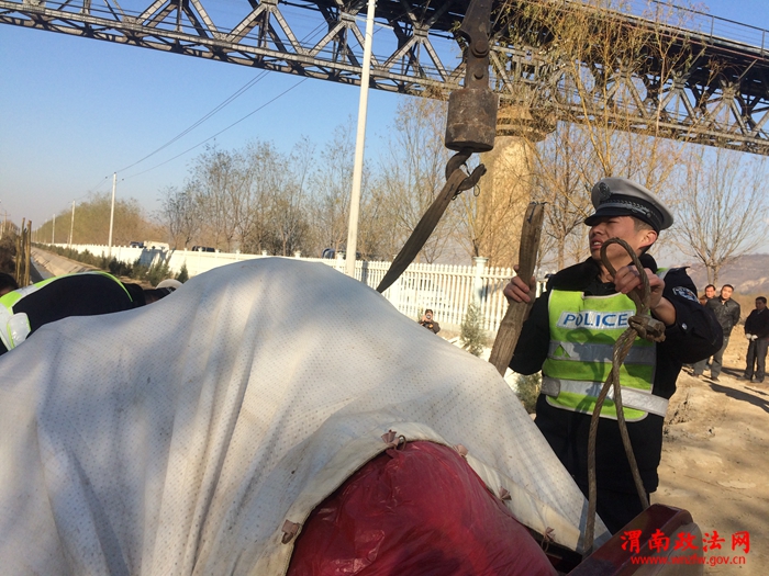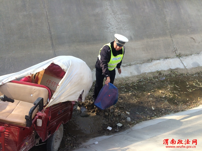 民警燕亚峰沿着路沿,下到渠中将侧翻车辆扶正,并将落入水潭中的车辆物品及时拾起。