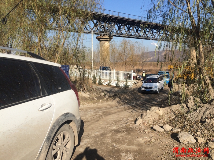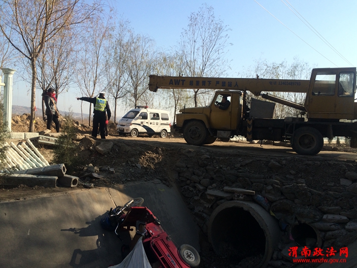 巡查至秦东污水处理厂以西铁路桥下,港口维修路段Z字型路口处时:看到一辆电动三轮车在拐弯处滑入路边抽黄渠中,幸亏驾驶员反应迅速、及时跳车没有受伤。民警立刻对事故车辆在渠中情况进行仔细观察,班长燕亚峰立刻拨打手机联系吊车,民警积极对被困车辆实施救援。