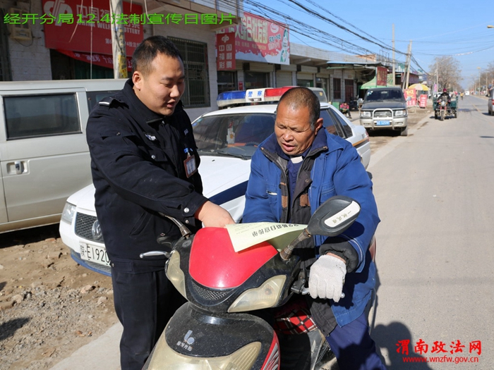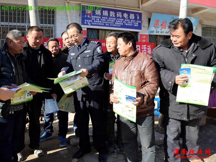 渭南政法网(特约通讯员 刘孟德)2015年12月4日上午,渭南经开区信义街道人头攒动、热闹非凡,许多身着制服的工作人员在这里微笑着、问答着、忙碌着,在人群中格外显眼,他们不时微笑地向过往群众递上宣传资料,又不时地热情地向前来咨询的群众作法律解答……他们就是由经开分局法制大队民警和龙背派出所民警组成的法律法规宣传小组。