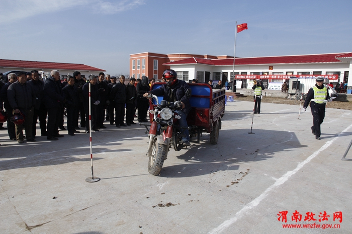 12月15日陕西省渭南市公安局交警支队临渭大队民警将三轮车场地考试搬到临渭区孝义镇金滩村村民家门口。