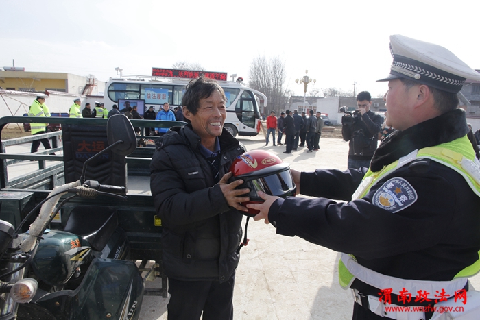 12月15日陕西省渭南市公安局交警支队临渭大队民警免费为临渭区孝义镇金滩村的摩托车、三轮车驾驶人赠送冬季保暖头盔。