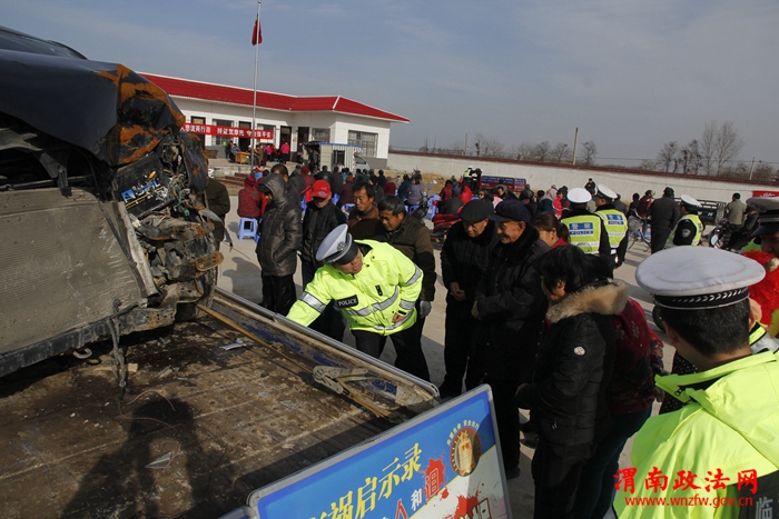 12月15日在陕西省渭南市临渭区孝义镇金滩村村委会广场上,临渭交警用醒目的交通事故残害车为村民进行普法宣传教育。