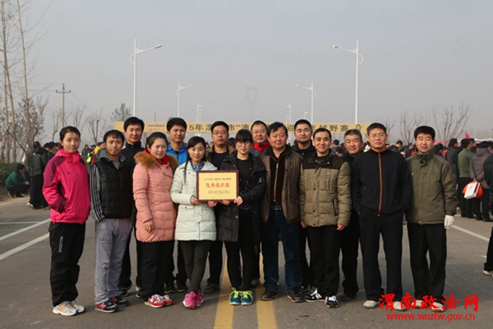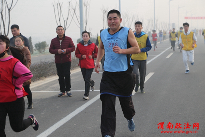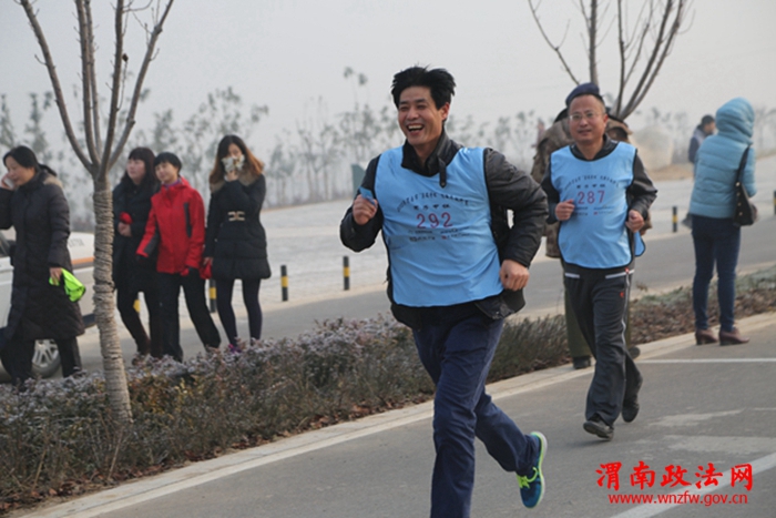 渭南政法网(特约通讯员 朱小龙 罗文)12月29日上午,渭南市“奥瑞特”杯迎新年越野赛在渭河北大堤渭蒲大桥下拉开帷幕,市直各部门、各企事业单位、学校、市民等数千人参加了此次迎新年越野赛。渭南中院20余名法官干警积极参与其中,奋力开跑,奋起直追,以饱满的热情迎接新年的到来。