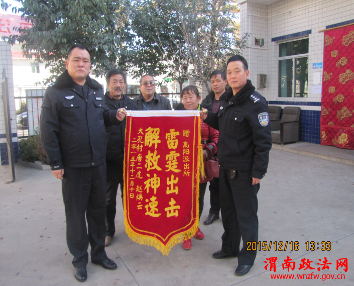 渭南政法网(特约通讯员 吝敏)近日,蒲城县公安局高阳派出所院内来了数名群众向派出所民警苏锋和雷钧赠送写有“雷霆出击 解救神速”的一面锦旗,并鸣放鞭炮表示感谢。