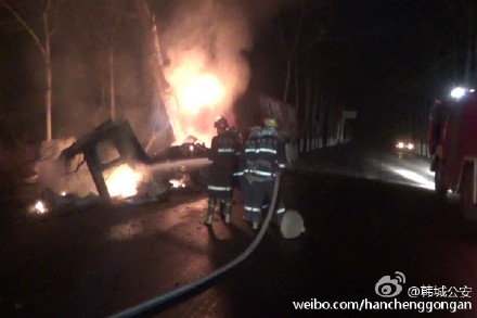 【凌晨半挂车起火万分危急 韩城消防成功扑救】12月28日,韩城108国道龙亭段,一辆半挂车冲出路面,撞上路边大树后起火,韩城消防接警后立即赶赴现场,经过约10分钟的紧张扑救,大火被成功扑灭,所幸事故无人员伤亡。 目前,事故原因正在进一步调查中。