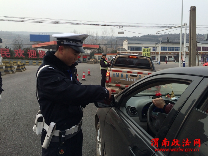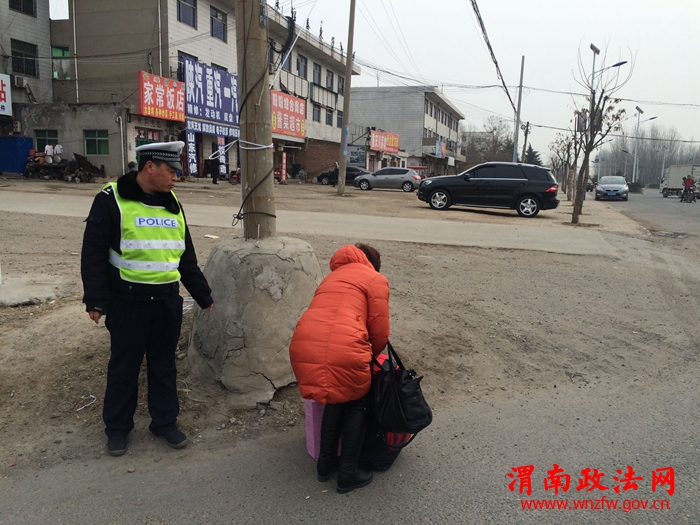 渭南政法网(特约通讯员 汤朗武 王栋炜)元月7日8时,潼关秦东交警中队指导员梁建华带领二班班长董宏计、民警李少云、马 征、邓建成等在秦东省际交通安全检查站执勤。民警董宏计看到一妇女站岗亭南侧公路行驶车道等车很危险,立刻上前对当事人进行提醒劝离!并向当事人指路!