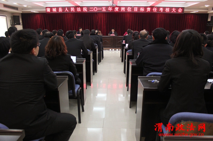岗位目标责任考核大会由蒲城法院党组书记、院长王玉琦主持,考核组副组长县考核办副主任白小红代表县考核组就考核的重要性、考核的内容、办法及坚持实事求是,成绩与问题并重的考核原则作了讲话。随后王玉琦院长代表院党组以图文并茂的形式向考核组及全院干警汇报了该院2015年度目标任务完成工作情况。王院长在汇报中谈到,2015年蒲城法院紧紧围绕“努力让人民群众在每一个司法案件中都感受到公平正义”的目标,坚持公正司法、司法为民这条主线,忠实履行宪法法律赋予的职责,各项工作都取得了新进展、新成效,为全县和谐稳定、经济发展以及平安建设、法治建设做出了新的贡献。接着从坚持依法履职,审判工作实现新突破;强化司法为民,保障群众权益;推进司法公开,提升司法公信;加强队伍和廉政建设,队伍建设焕发新面貌;夯实基层基础,稳步提升物质装备建设5个方面向考核组及全院干警作了详尽汇报。同时对新形势下法院工作面临的困难与挑战及其应对策略作了客观说明。