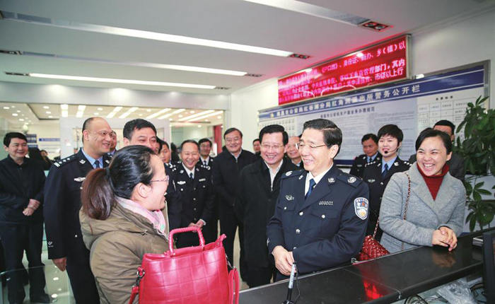 1月8日至10日国务委员、公安部部长郭声琨在江西调研。图为郭声琨在南昌红角洲派出所与办事群众亲切交谈,征求他们对公安机关社会治安、为民服务工作的意见。张建鑫 摄