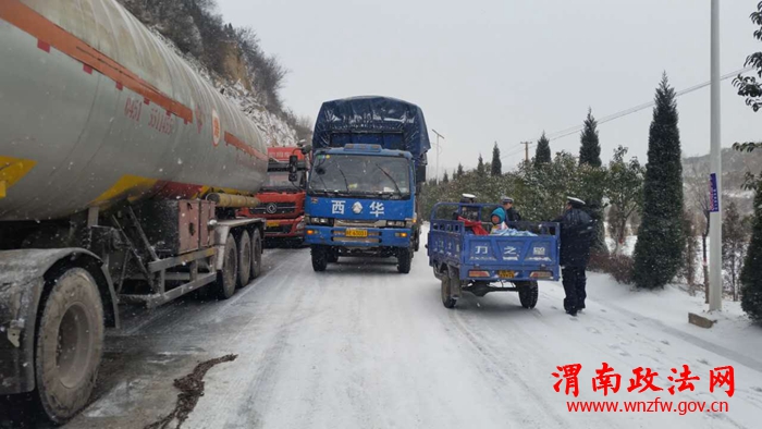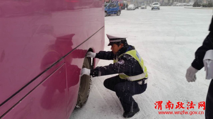 雪情就是命令,城区中队立即启动恶劣天气应急预案,中队长孙杰、副中队长王亚林带领各巡查班分别在东坡口、汽车站、中心街十字、桃林路十字设立特岗,检查出城客车防滑链,指挥疏导车辆,确保交通安全。