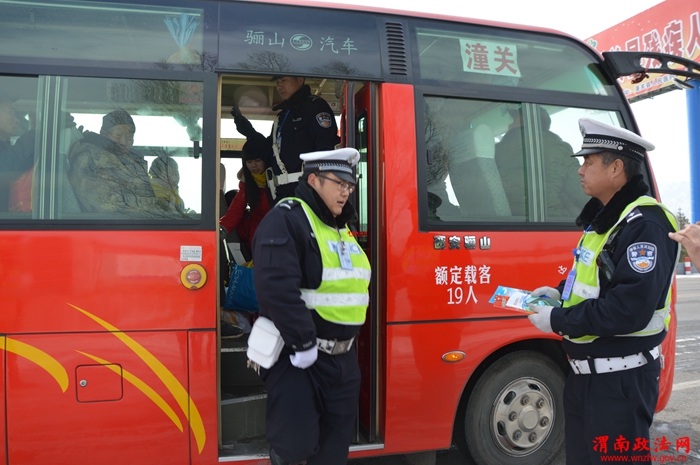 渭南政法网(特约通讯员 刘军峰)2016年1月24日,全国春运启动日。潼关县交警大队为遏制重、特大道路交通事故的发生,切实做好春运道路交通安全管理工作,严格按照渭南市交警支队的统一部署,于上午10时潼关汽车站举行以主题为“平安春运·交警同行”声势浩大的春运启动日活动,全面拉开2016年春运道路交通安全工作序幕。