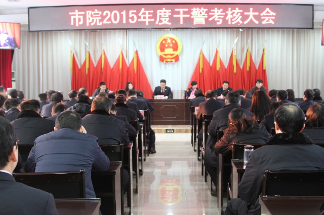 1月28日上午,市检察院召开2015年度干警考核大会,市院班子成员及全院干警参加了会议。市院党组成员、副检察长兼反贪局长贾俊海主持会议,市院党组书记、检察长李逸强作重要讲话,市委组织部、市人社局有关负责同志参加并指导会议。