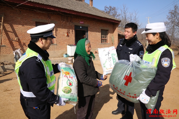 渭南政法网(特约通讯员 张亮)1月26日,陕西省渭南市交警支队临渭大队在开展“寒冬送温暖警民手牵手”民生警务活动中,为秦岭深处困难户候小婷送来了棉被、面粉、大米、食用油等过年生活用品。据了解,几天来该大队先后为困难群众送年货和春运出行交通指南宣传品200多套件,价值5万余元。