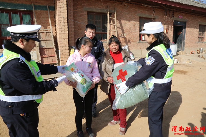 1月26日陕西省渭南市交警支队临渭大队为山区贫困户候小婷送过年用品。