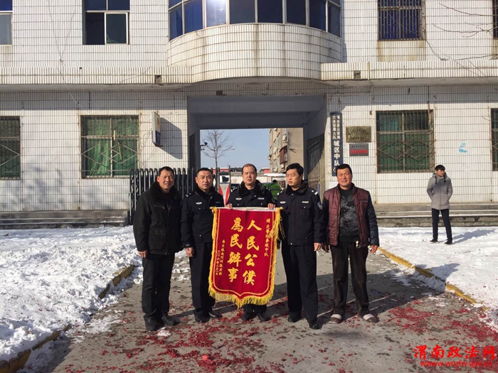 渭南政法网(特约通讯员 刘军峰 汤朗武)2016年2月1日10时许,潼关交通事故当事人张某等人,将一面写有“人民公仆,为民办事”的锦旗送到事故预防与处理中队,以感谢事故中队民警公平、公正、及时的处理其交通事故。