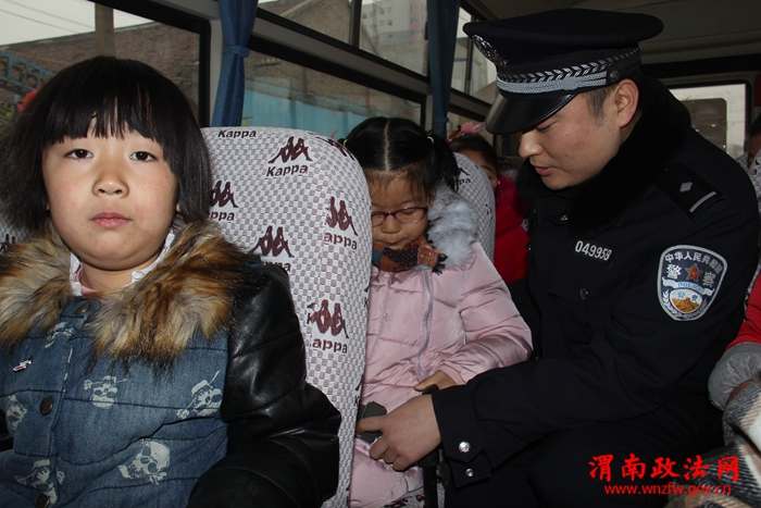 图为民警正在向幼儿园小朋友讲解乘坐校车系好安全带的重要性。