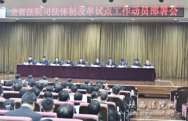 去年12月 9日,中央全面深化改革小组第19次会议决定,今年在包括我省在内的13个省区市全面推开司法体制改革试点工作。陕西高院党组成立了司法体制改革试点工作 领导小组,下设司法改革办公室。为使改革顺利启动、落地生根,陕西高院组成四个专题调研组,深入基层摸清了全省人员队伍底数、案件底数、审判权力运行、司 法资源配置状况等情况,并积极借鉴其他省市法院经验做法,依据中央和省委的顶层设计,制定试点工作《实施方案》及18项相关配套制度,并确定了咸阳中院、 榆林中院、蓝田县法院、富县法院、永寿县法院、华阴市法院、南郑县法院、紫阳县法院、清涧县法院、洛南县法院、铜川市耀州区法院、宝鸡市金台区法院等十二 个试点法院。以这次会议为标志,全省法院司法体制改革试点工作进入实施阶段。