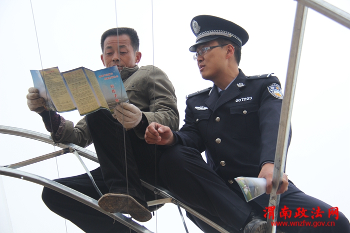 3月7日,民警正在一在建大棚上向农民宣传平安创建知识。