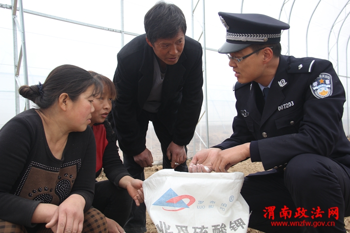 渭南政法网(特约通讯员 刘苍锋)眼下正值春耕春播时节,富平县公安局留古派出所组织民警深入田间地头开展治安隐患排查和平安创建、农资打假宣传活动,向群众详细讲解设施大棚等春耕物资防盗、防火安全防范知识以及如何辨别种子、农药、化肥等农资产品的优劣,确保春耕生产平安进行。图为3月7日,民警正在辖区一设施大棚内向群众宣传优劣农资产品分辨知识。