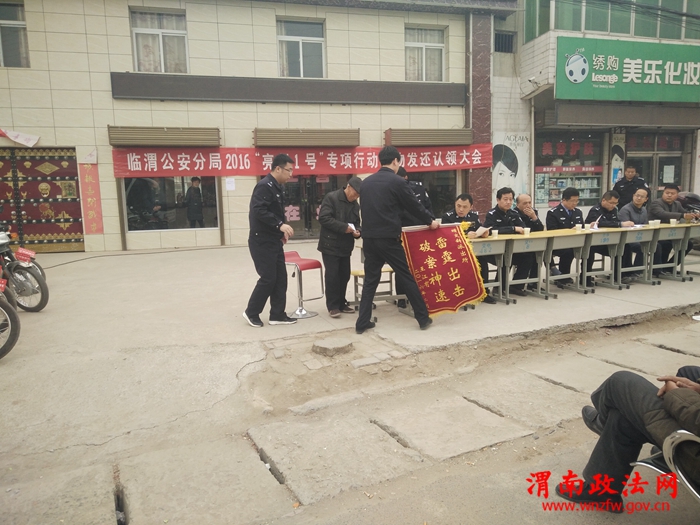 渭南政法网(特约通讯员 张旭阳)3月8日,孝义镇协助临渭分局交斜派出所在交斜街道举办了临渭公安分局2016“亮剑1号”专项行动赃物发还认领大会。出席本次大会的有,临渭分局常务副局长王希强,临渭分局副局长李进荣、张战宏,临渭刑警大队长雷西康,固市派出所所长王峰,交斜派出所所长王进锋,交斜镇综治办主任,孝义镇综治办主任张军华,丢失车辆的失主以及围观的很多群众,本次大会上共有数十余量盗脏车辆被返还至人民群众的手中,极大程度的挽回了人民群众的财产安全。
