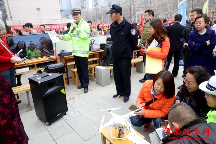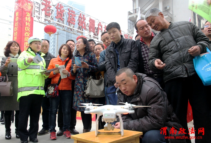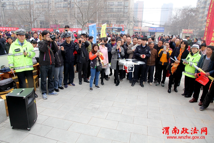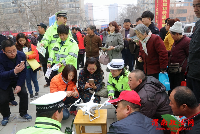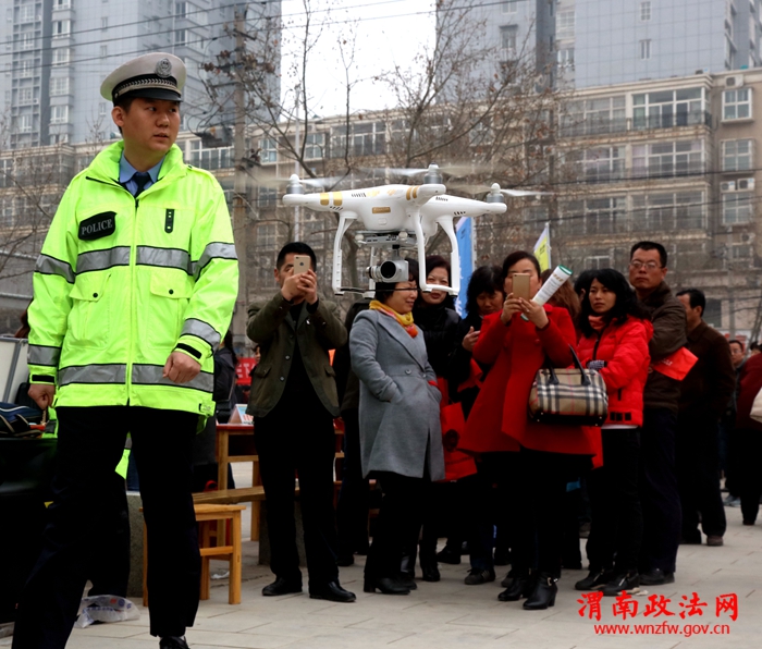 3月17日,渭南市文化科技下乡活动的大集上好不热闹,陕西省渭南市公安局交警大队事故科的民警也来 赶集,民警用无人机拍摄实时路况场景,车辆事故场面,以新的角度让人们了解酒驾、毒驾、疲劳驾驶、随意变道等交通违法行为所带来的危害,与此同时新的科学 技术也给赶集的市民带来了乐趣。这是人们围观无人机的场景。