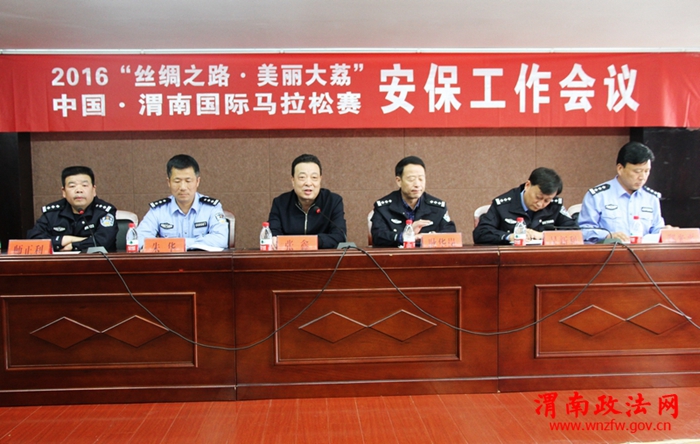 渭南市公安局党委委员、副局长张鑫参加会议并作了重要讲话,他要求全体参战民警明晰安保工作任务,树立大局意识,精诚团结、万众一心、齐心协力、不懈奋斗、文明执勤、忠诚履职,誓保2016年“丝绸之路·美丽大荔”中国渭南国际马拉松赛事圆满成功。