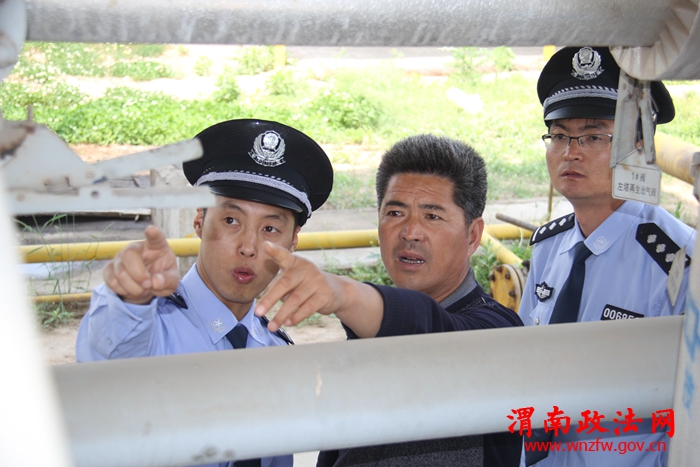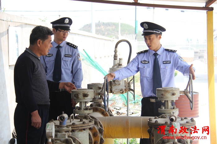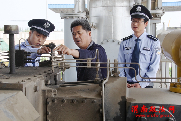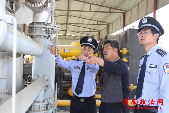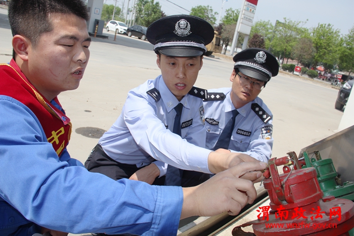 图为4月24日,民警在对辖区润富液化气站和加油站油料安全存储情况进行检查。