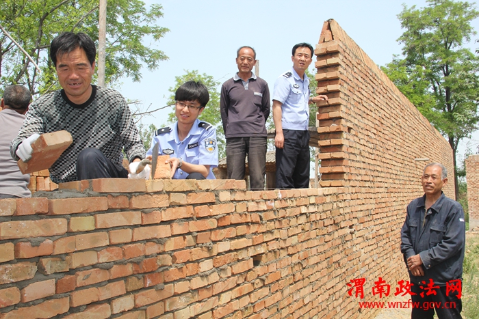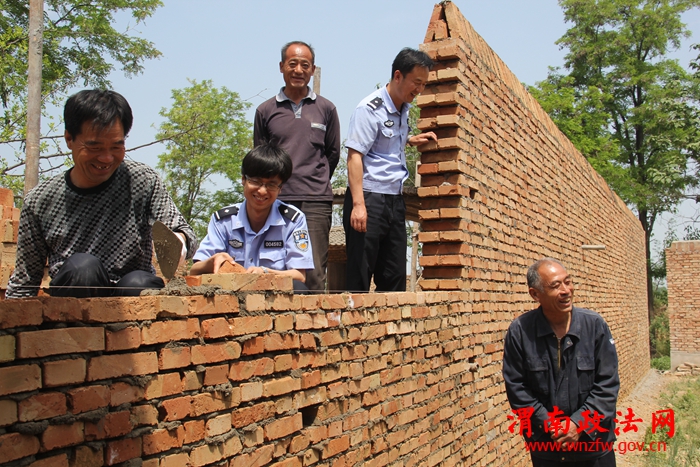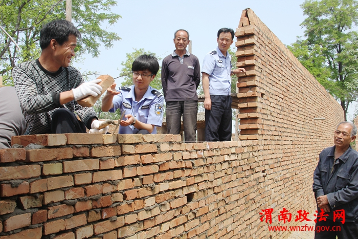 渭南政法网(特约通讯员 刘苍锋)富平县张桥镇村民吴某与赵某(右一)两邻居从2004年开始因为宅基地墙界发生纠纷,期间虽经司法、土地等部门多次调解未果,使得一面影响两家感情的“隔阂墙”支撑时间长达12年之久。今年3月26日,双方又因界墙发生口角。富平县公安局张桥派出所接到报警后,民警通过调查走访,启动由该所探索出的渭南市首家以基层派出所、司法办、综治办、土地所、民政办、村委会组成的“六方会谈”矛盾纠纷调解机制,组织双方当事人进行了矛盾纠纷调解。经过一个月的调解沟通,两邻居终于握手言和。图为5月4日,民警和村民正在帮助吴赵两家紧张施工修建即将竣工的“和谐墙”。